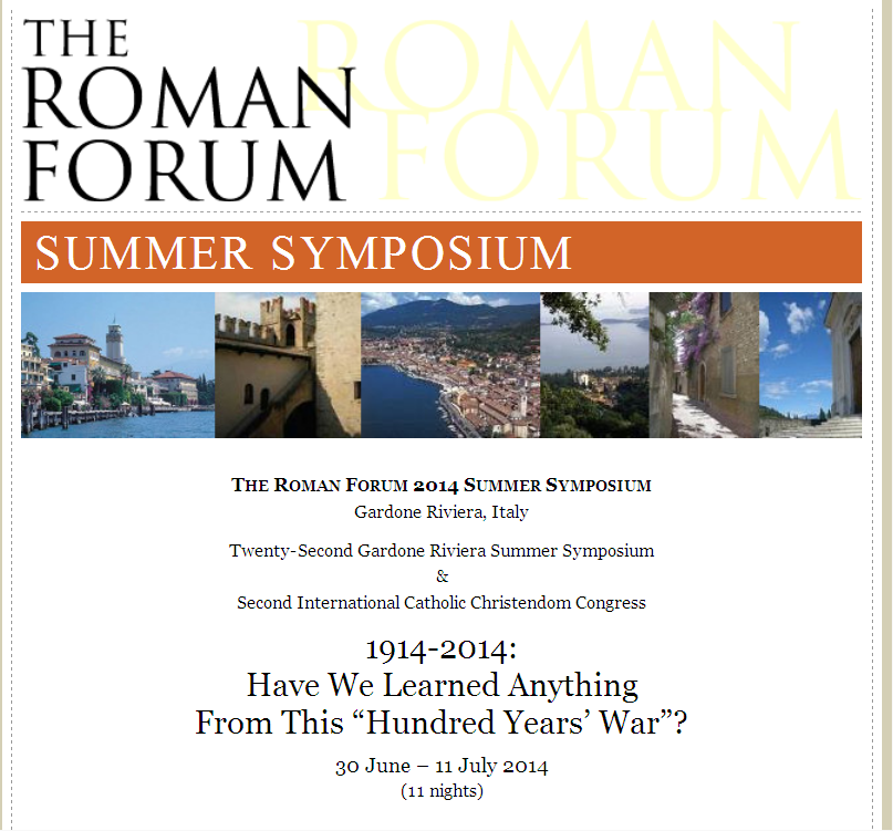 Gardone Riviera, 2 julio 2014, la Visitación de Ntra. Sra.; Stos. Proceso y Martiniano, mártires. [FARO]. The Roman Forum es una asociación creada por el filósofo Dietrich von Hildebrand y que dirige desde hace años el profesor John Rao, de la Universidad San Juan, de Nueva York. En verano celebra un curso en el Lago de Garda, en el que participan algunos de nuestros amigos y colaboradores como los profesores Danilo Castellano y Miguel Ayuso o monseñor Ignacio Barreiro. Este año el tema central está girando en torno a los cien años desastrosos que median entre 1914, fecha del inicio de la Primera Guerra Mundial, y el corriente de 2014 (1914-2014: Have We Learned Anything From This «Hundred Years’ War»?). Todos los días se celebra la Santa Misa, según el rito romano tradicional, en la iglesia parroquial de Gardone Riviera, con la intervención de un coro excelente. Entre los oradores se encuentran, además de John Rao, el profesor John Médaille (que fue alumno del inolvidable Frederick D. Wilhelmsen), Michael Matt (editor de The Remnant), el teólogo austriaco Thomas Stark, el jurista Christopher Ferrara, etc.