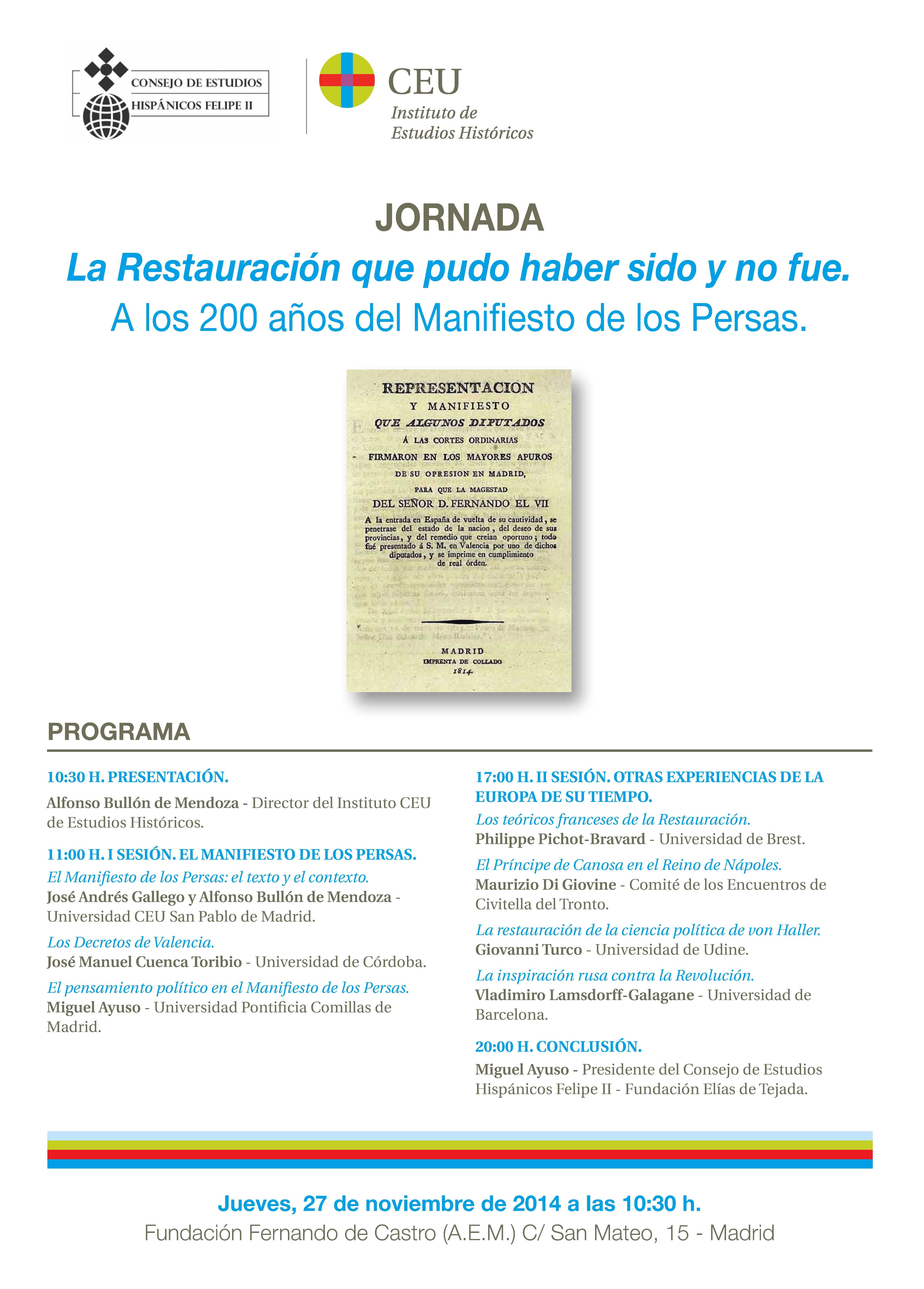 El Instituto CEU de Estudios Históricos y el Consejo de Estudios Hispánicos Felipe II organizan en Madrid la jornada La Restauración que pudo haber sido y no fue. A los 200 años del Manifiesto de los Persas, el jueves 27 de noviembre de 2014, a partir de las 10:30 (diez y media de la mañana), en la Fundación Fernando de Castro. Más información en este mismo cuaderno de bitácora.