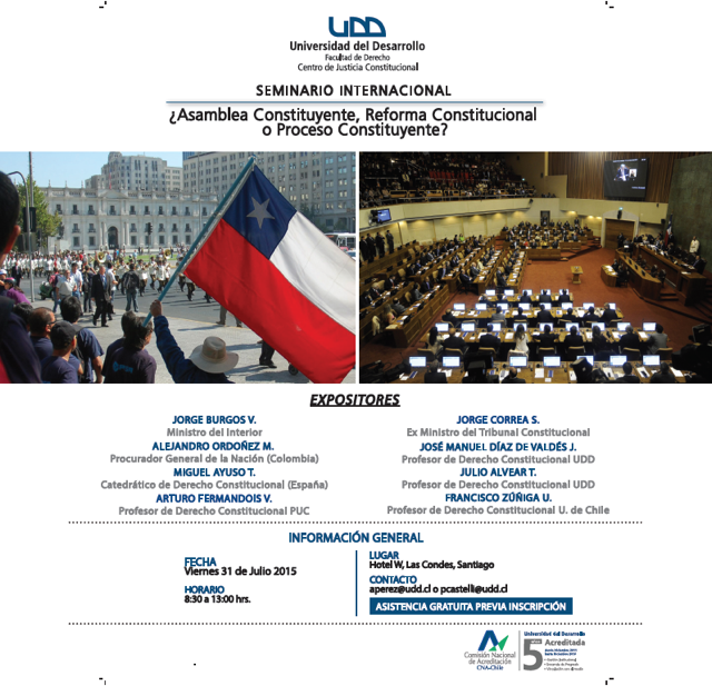 Tres miembros del Consejo de Estudios Hispánicos Felipe II participarán, D.m., en el seminario internacional que bajo el título ¿ASAMBLEA CONSTITUYENTE, REFORMA CONSTITUCIONAL O PROCESO CONSTITUYENTE? organizan la Facultad de Derecho y el Centro de Justicia Constitucional de la Universidad del Desarrollo, el viernes 31 de julio de 2015, entre las 08:30 y las 13:00 horas, en el Hotel W Santiago (Las Condes).