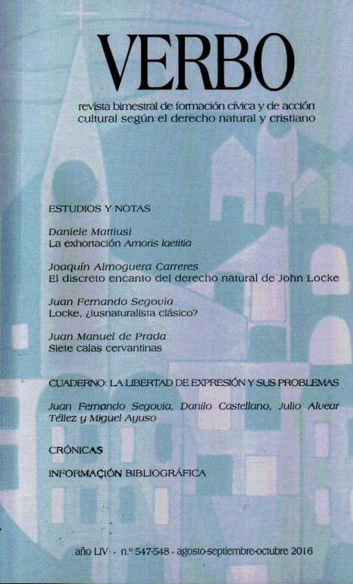 Número 547-548 de Verbo, revista bimestral de formación cívica y de acción cultural según el derecho natural y cristiano, con fecha agosto-septiembre-octubre de 2016. Que continúa regularmente la extraordinaria historia de esta publicación fundada en 1961 por Eugenio Vegas Latapie y Juan Vallet de Goytisolo, y que en la actualidad dirige el también presidente del Consejo de Estudios Hispánicos Felipe II, el catedrático Miguel Ayuso.