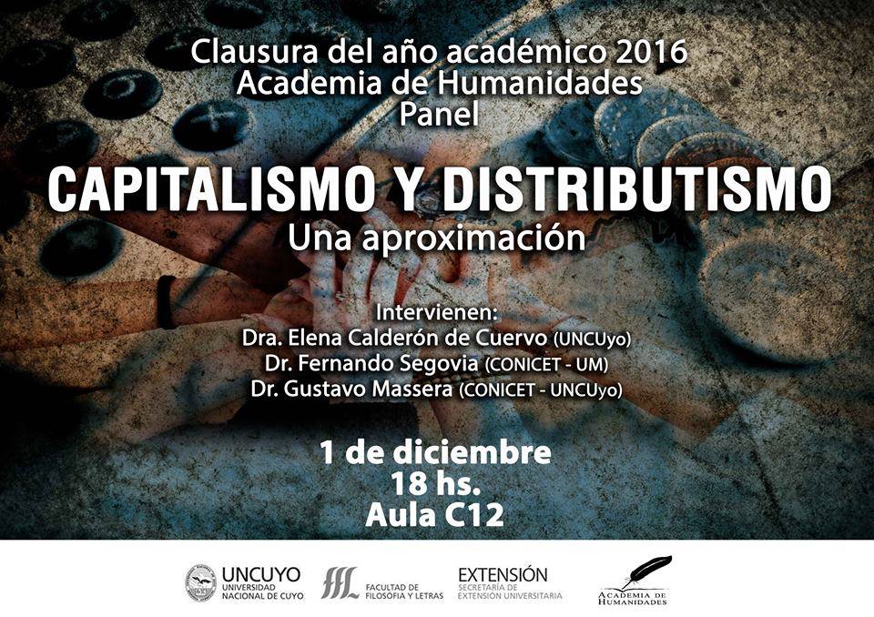 El jueves 1 de diciembre de 2016, a las 18:00 (seis de la tarde), a manera de clausura del año académico 2016 de la Academia de Humanidades de la Universidad Nacional de Cuyo (Mendoza, Argentina) tendrá lugar en la Facultad de Filosofía y Letras de la UNCuyo (Aula C12) un interesante coloquio, con el título «Capitalismo y distributismo. Una aproximación».