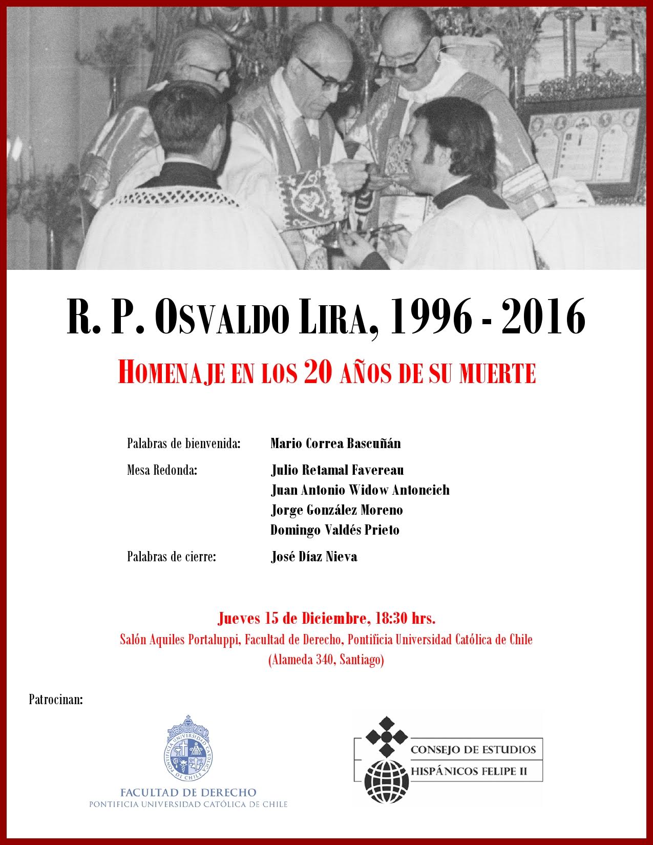 Continuando con los actos dedicados al XX aniversario del Reverendo Padre Osvaldo Lira Pérez, que dieron comienzo en Viña del Mar el pasado día 2, el próximo jueves día 15 de diciembre de 2016 (D.m.) tendrá lugar en Santiago de Chile una mesa redonda bajo el título «R.P. Osvaldo Lira, 1996-2016. Homenaje en los 20 años de su muerte». A las 18:30 (seis y media de la tarde) en el Salón Aquiles Portaluppi de la Facultad de Derecho de la Pontificia Universidad Católica de Chile (Alameda, 340, Santiago).