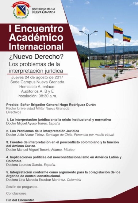 FARO (Redacción), agosto 2017. Prosiguiendo con su gira estival por Ultramar, El profesor Miguel Ayuso ha visitado Santafé de Bogotá para participar en el I Encuentro Académico Internacional «¿Nuevo Derecho? Los problemas de la interpretación jurídica», en el Campus de Cajicá de la Universidad Militar de la Nueva Granada. Allí impartió la conferencia inaugural sobre «La interpretación jurídica ante la crisis institucional y normativa». También dictó un seminario sobre «Los problemas actuales de la enseñanza del derecho» y una lección sobre «A qué se llama Nuevo Derecho».