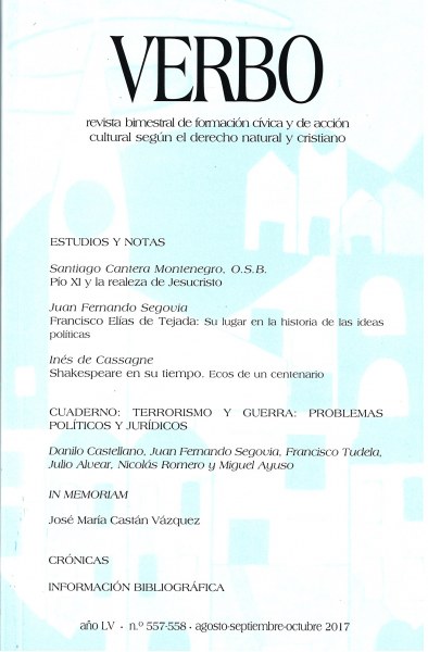 En esta nueva entrega de Verbo ofrecemos a nuestros lectores, para empezar, tres estudios. En el primero, el historiador benedictino Santiago Cantera estudia la encíclica de Pío XI Quas primas, dedicada a la realeza social de Nuestro Señor Jesucristo. Siempre viene bien evocarla y más aún al llegar su fiesta litúrgica a finales de octubre. Es de recordar, a este propósito, el texto que nuestro colaborador recientemente fallecido monseñor Ignacio Barreiro dedicó al asunto en el volumen Iglesia y Política: cambiar de paradigma y en el que destacaba la distorsión de la doctrina de la encíclica producida por la nueva ubicación de la fiesta al final del año litúrgico en el calendario del novus ordo. A continuación el investigador del CONICET argentino Juan Fernando Segovia dedica un texto sintético y bien interesante a la historia de las ideas políticas de nuestro llorado colaborador Francisco Elías de Tejada. De esta manera, como ya saben nuestros lectores, se suma Verbo a la conmemoración de su centenario. En el número 13 de Fuego y Raya, ya aparecido, y en el volumen correspondiente a 2017 de los Anales de su Fundación habrá de tener más espacio este recuerdo. Finalmente, la profesora Inés de Cassagne, de la Universidad Católica Argentina (Buenos Aires) nos ofrece unos ecos del centenario de Shakespeare, precedidos de una aguda comparación del autor inglés con Cervantes. De ambos se cumplió el cuarto centenario de la muerte el pasado 2016. Y si el segundo fue recordado a través de la pluma certera de nuestro colaborador Juan Manuel de Prada, el primero recibe ahora su espacio en forma de balance una vez transcurrido el año de la efeméride.
