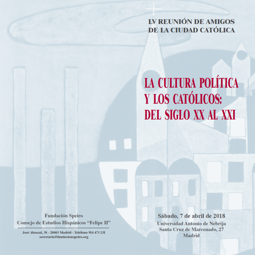 «La cultura política y los católicos: del siglo XX al XXI» es el tema este año de la LV Reunión de Amigos de la Ciudad Católica, que la Fundación Speiro (con la colaboración del Consejo de Estudios Hispánicos Felipe II) anuncia para el sábado 7 de abril de 2018 en la sede que la Universidad Antonio de Nebrija tiene en la calle de Santa Cruz de Marcenado, número 27, de Madrid.
