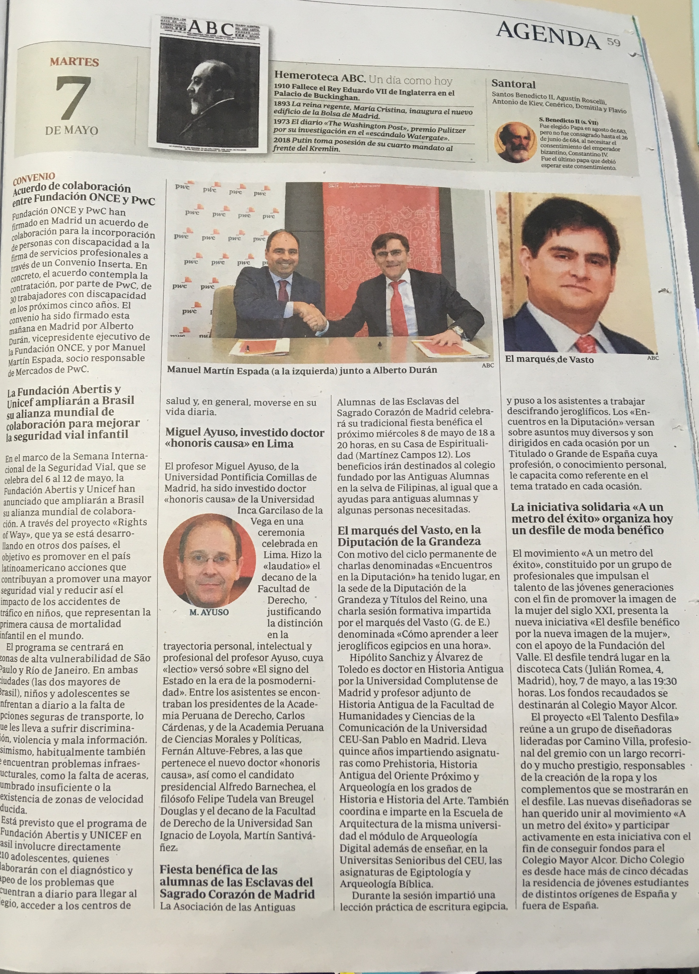 El Presidente del Consejo de Estudios Hispánicos Felipe II, Miguel Ayuso Torres, ha recibido el doctorado honoris causa por la Universidad Inca Garcilaso de la Vega, de Lima, que le había sido otorgado el pasado año. Así aparecía la noticia en el diario madrileño ABC de este martes:
