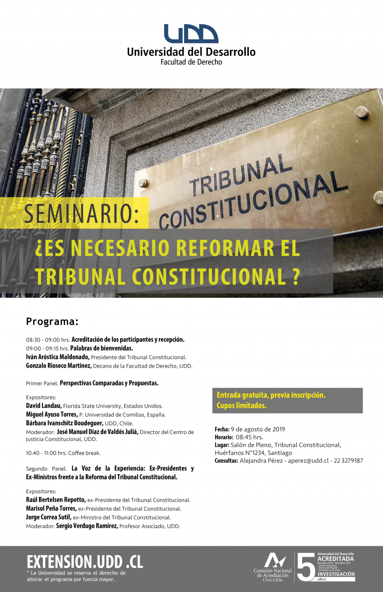 En el seminario que, organizado por la Universidad del Desarrollo bajo el título «¿Es necesario reformar el Tribunal Constitucional?», se celebrará el viernes 9 de agosto en Santiago del Nuevo Extremo, en el Salón del Pleno de dicho tribunal (Huérfanos, Nº 1234), intervendrá entre otros ponentes el presidente del Consejo de Estudios Hispánicos Felipe II, Miguel Ayuso, catedrático de Derecho Constitucional y Ciencia Política en la Universidad Pontificia de Comillas (Madrid).