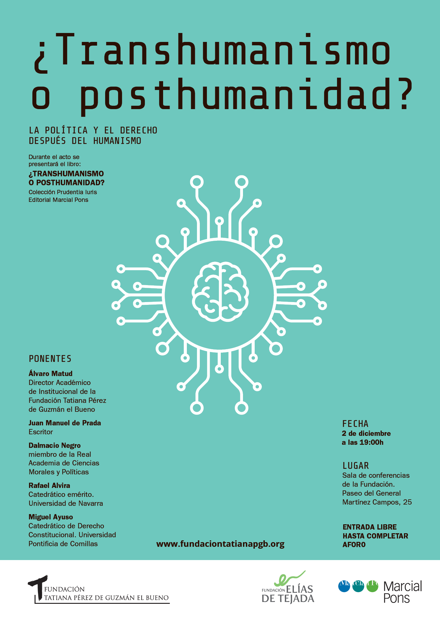El lunes 2 de diciembre de 2019 tendrá lugar en la villa de Madrid un acto titulado «¿Transhumanismo o posthumanidad? La política y el derecho después del humanismo». Da comienzo a las 19:00 (siete de la tarde, D.m.) en la sala de conferencias de la Fundación Tatiana Pérez de Guzmán el Bueno (Paseo Martínez Campos, 25; Metro Iglesia), coorganizadora del mismo junto con la Fundación Francisco Elías de Tejada y con Marcial Pons, Ediciones Jurídicas y Sociales.