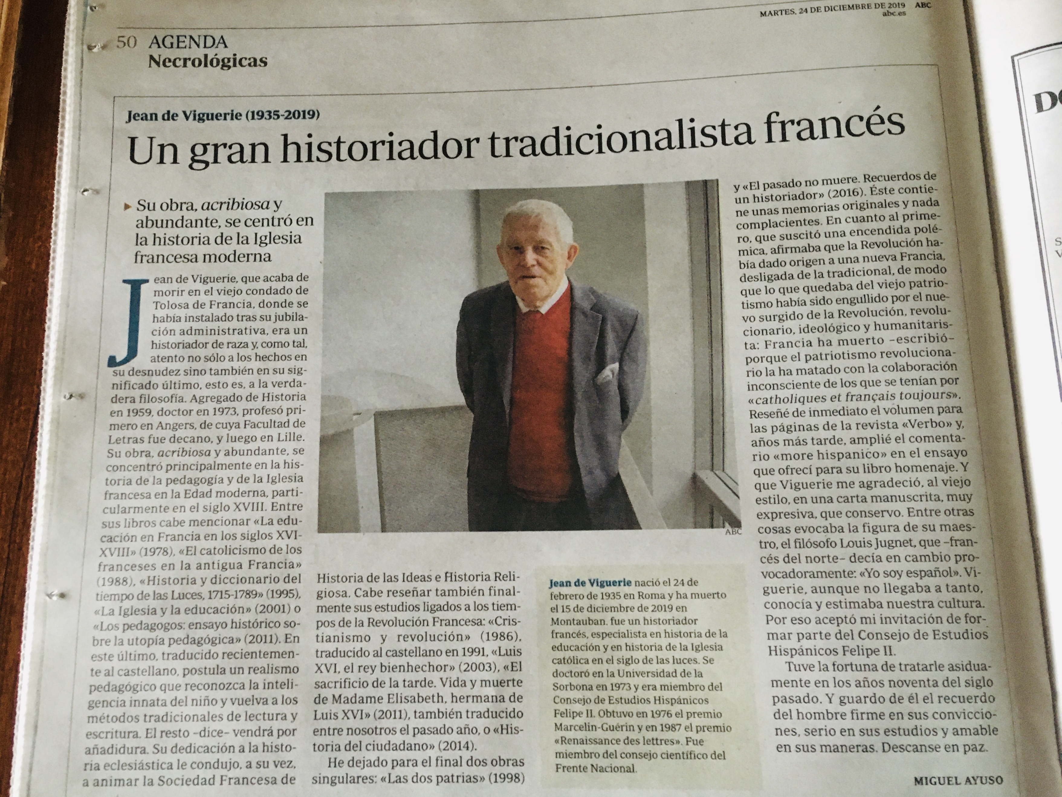 El pasado día 15 de diciembre falleció en el Montalbán occitano Jean de Viguerie, miembro del Consejo de Estudios Hispánicos Felipe II. El presidente del Consejo firma este obituario publicado en el diario madrileño ABC en la vigilia de la Natividad de Nuestro Señor.