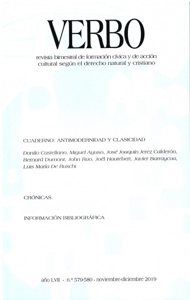 El presente número de Verbo, revista bimestral de formación cívica y de acción cultural según el derecho natural y cristiano, es casi un monográfico. Decimos «casi» porque al cuaderno central «Antimodernidad y clasicidad» que ocupa la mayor parte de sus páginas, hay que añadir las crónicas y la información bibliográfica. Y por supuesto su presentación: