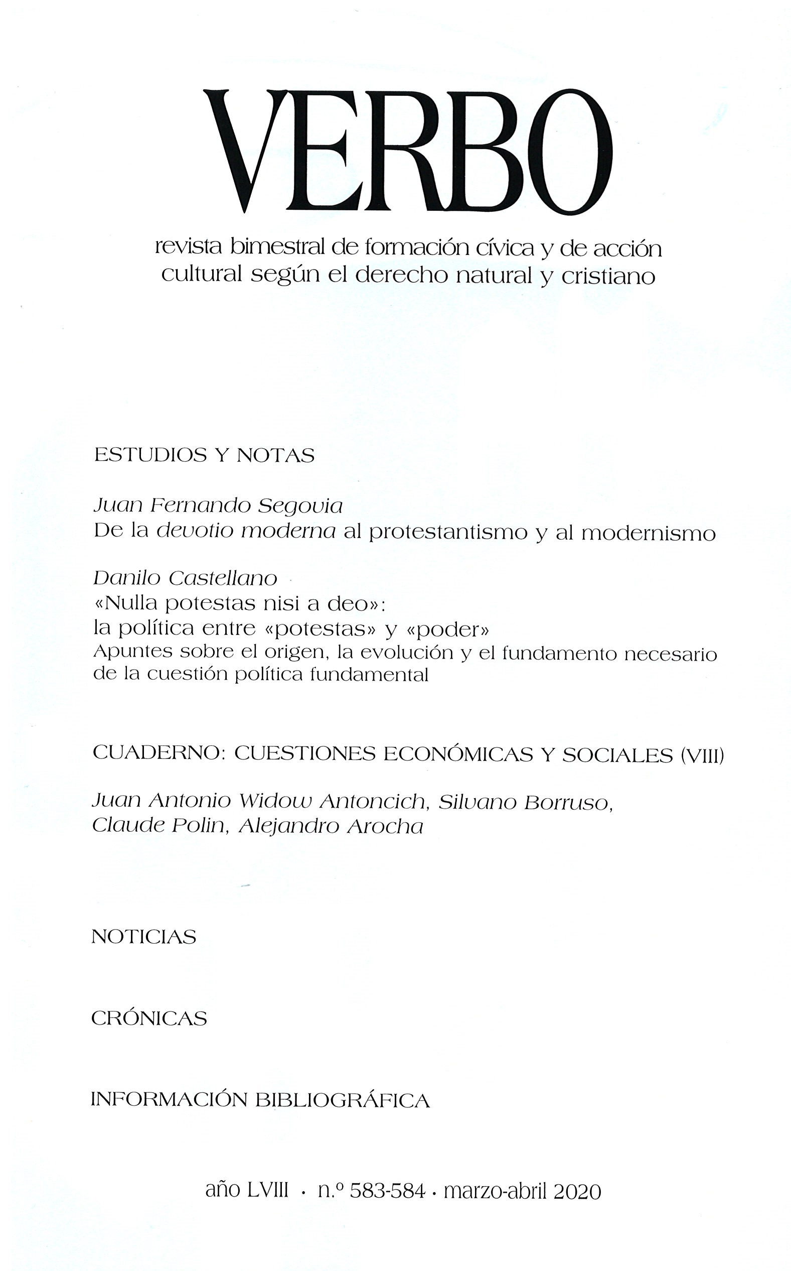 En esta entrega de Verbo encontramos un cuaderno centrado en cuestiones económico-sociales, con cuatro textos, y dos estudios fuera de dossier. Respecto de éstos, corresponden a dos de nuestros colaboradores más constantes e importantes: el profesor mendocino Juan Fernando Segovia, que escribe sobre la devotio moderna, mientras que el colega friulano Danilo Castellano lo hace sobre la naturaleza del poder político. Éste es un adelanto de la versión castellana de su libro Claves de política, reseñado en nuestro número anterior, que está pendiente de aparición en versión castellana por los tipos de Dykinson.