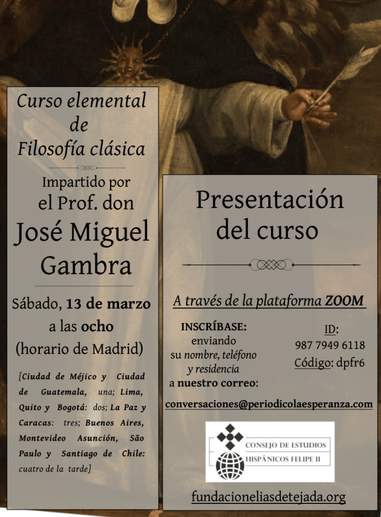 Este sábado 13 de marzo de 2021 tendrá lugar (D.m.) la primera sesión del curso elemental de filosofía clásica del Consejo de Estudios Hispánicos Felipe II, que impartirá el Profesor José Miguel Gambra. Consistirá en una charla de presentación.