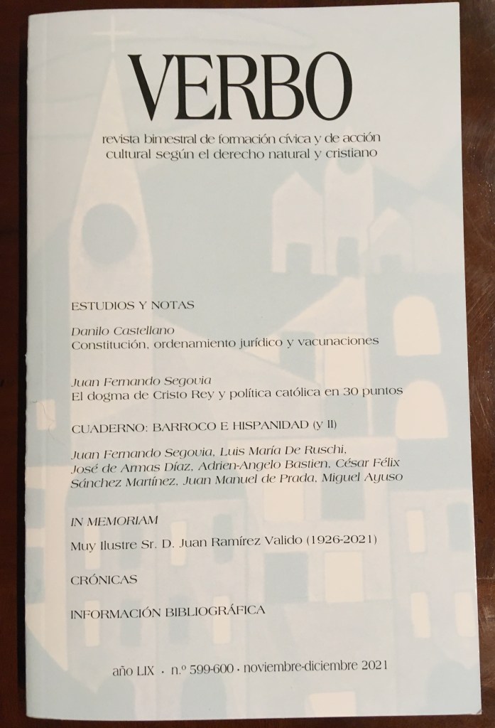Durante las Navidades se recibió el ejemplar correspondiente a noviembre-diciembre de 2021 de Verbo, revista bimestral de formación cívica y de acción cultural según el derecho natural y cristiano. Número cuyo Cuaderno, «Barroco e Hispanidad (y II)», continúa al del 597-598. Y además, como señala su Presentación,