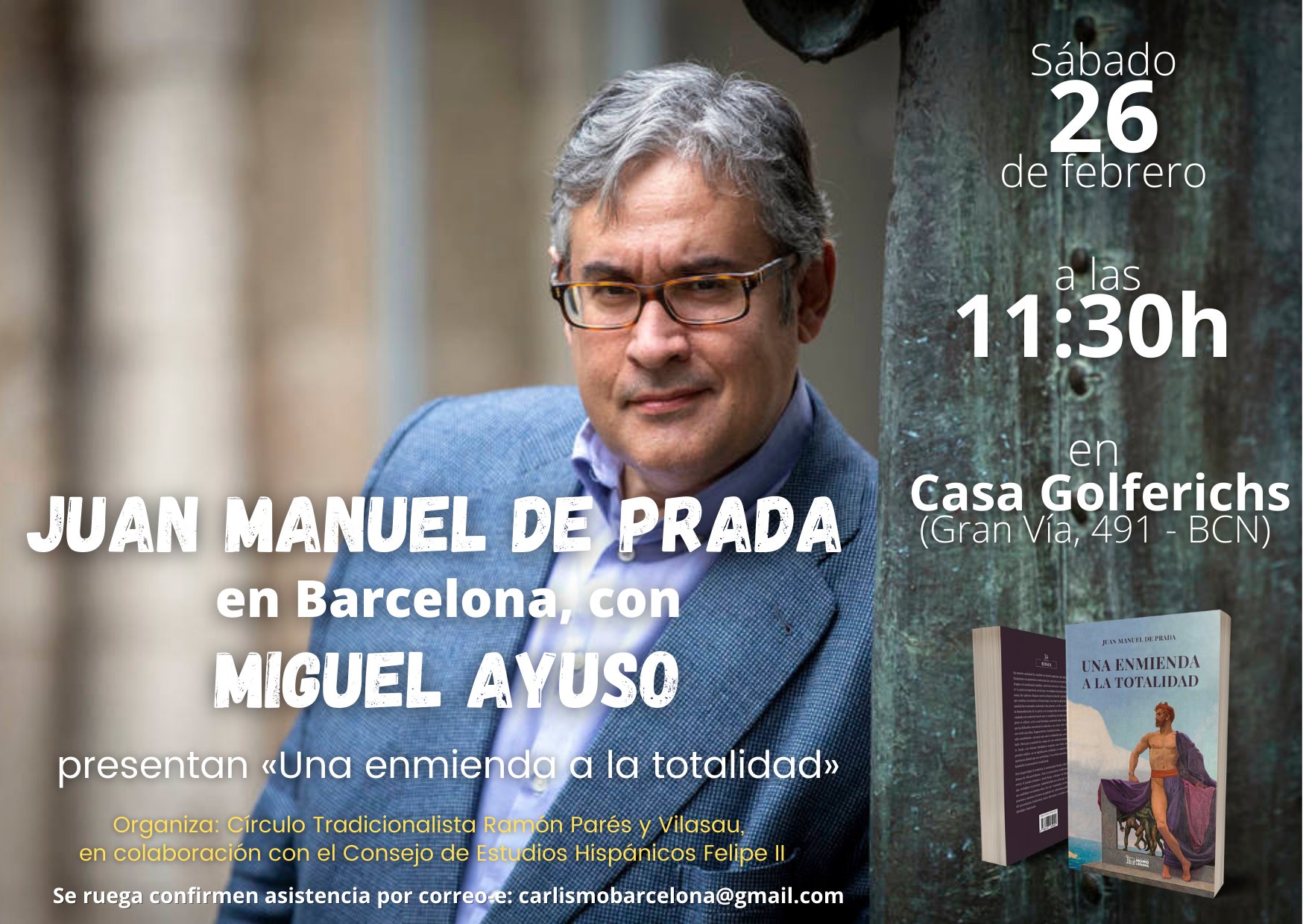 El último libro del escritor y periodista Juan Manuel de Prada, Una enmienda a la totalidad, se presentó en Madrid con gran éxito el 29 de noviembre pasado. Ahora el Círculo Tradicionalista Ramón Parés y Vilasau, de Barcelona, en colaboración con el Consejo de Estudios Hispánicos Felipe II, invita a la presentación en la Ciudad Condal del mismo libro, que realizará su autor en compañía del Profesor Miguel Ayuso.