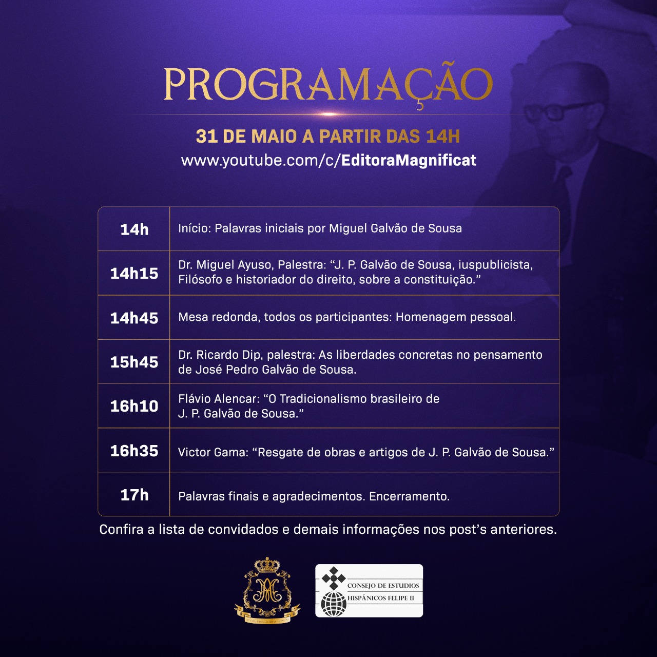 Hoy jueves 31 de mayo de 2022 la editorial brasileña Magnificat, en colaboración con el Consejo de Estudios Hispánicos Felipe II, organiza un homenaje a la memoria del Excmo. Sr. D. José Pedro Galvão de Sousa (1912-1992). Contará con la intervención de varios ilustres invitados, entre ellos las de Miguel Galvão de Sousa (hijo del homenajeado), Miguel Ayuso, Ricardo Dip, Vicente Amadei, Liliana Bittencourt, Victor Gama y Flávio Alencar. Tras las distintas ponencias habrá una mesa redonda.