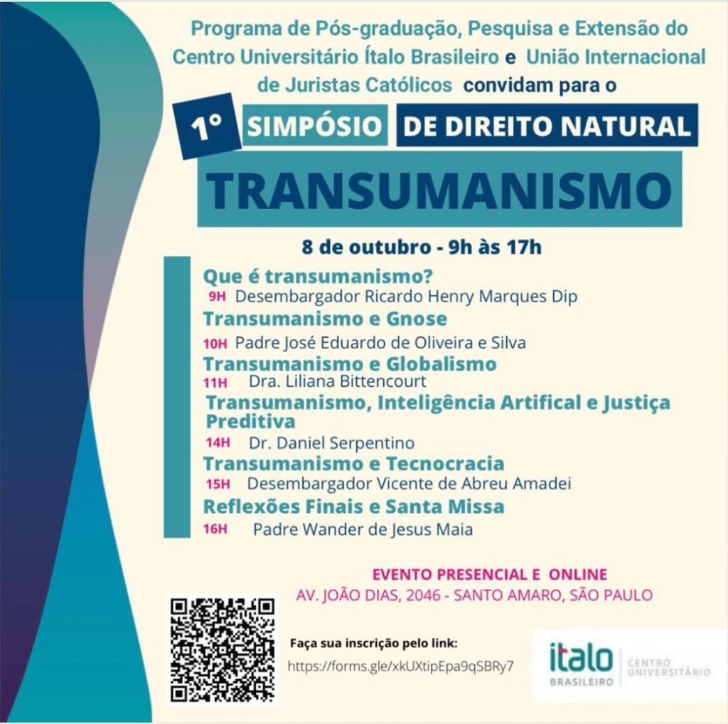 El Programa de Posgrado, Investigación y Extensión del Centro Universitario Italo Brasileño y la Unión Internacional de Juristas Católicos (que preside Ricardo Marques Dip, director del Centro de Estudios de Derecho Natural del Consejo de Estudios Hispánicos Felipe II) invitan al Primer Simposio de Derecho Natural de San Pablo (Brasil), con el tema «Transhumanismo».