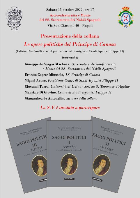 Nápoles, 15 octubre 2022, Santa Teresa de Jesús, copatrona de España. [FARO]. En la Archicofradía de Nobles Españoles de Santiago se han presentado los tres primeros volúmenes de la colección de las obras políticas del Príncipe de Canosa, Antonio Capece Minutolo (1768-1838), uno de los más ilustres representantes del tradicionalismo napolitano. Por su oposición a la «política de amalgama» padeció la incomprensión y la persecución. Embajador en la España de Fernando VII en 1814 y ministro posteriormente en 1816 y 1821, hubo de dejar el Reino para acogerse al Ducado de Módena de Francisco IV (padre de Francisco V, de la Condesa de Chambord y de Doña María Beatriz, madre ésta de Don Carlos VII y Don Alfonso Carlos). Metternich quiso impedir la publicación de sus libros; el Príncipe de Canosa, en una carta de 1836 al Rey de las Dos Sicilias, se muestra decididamente partidario de la causa de Don Carlos V en España.