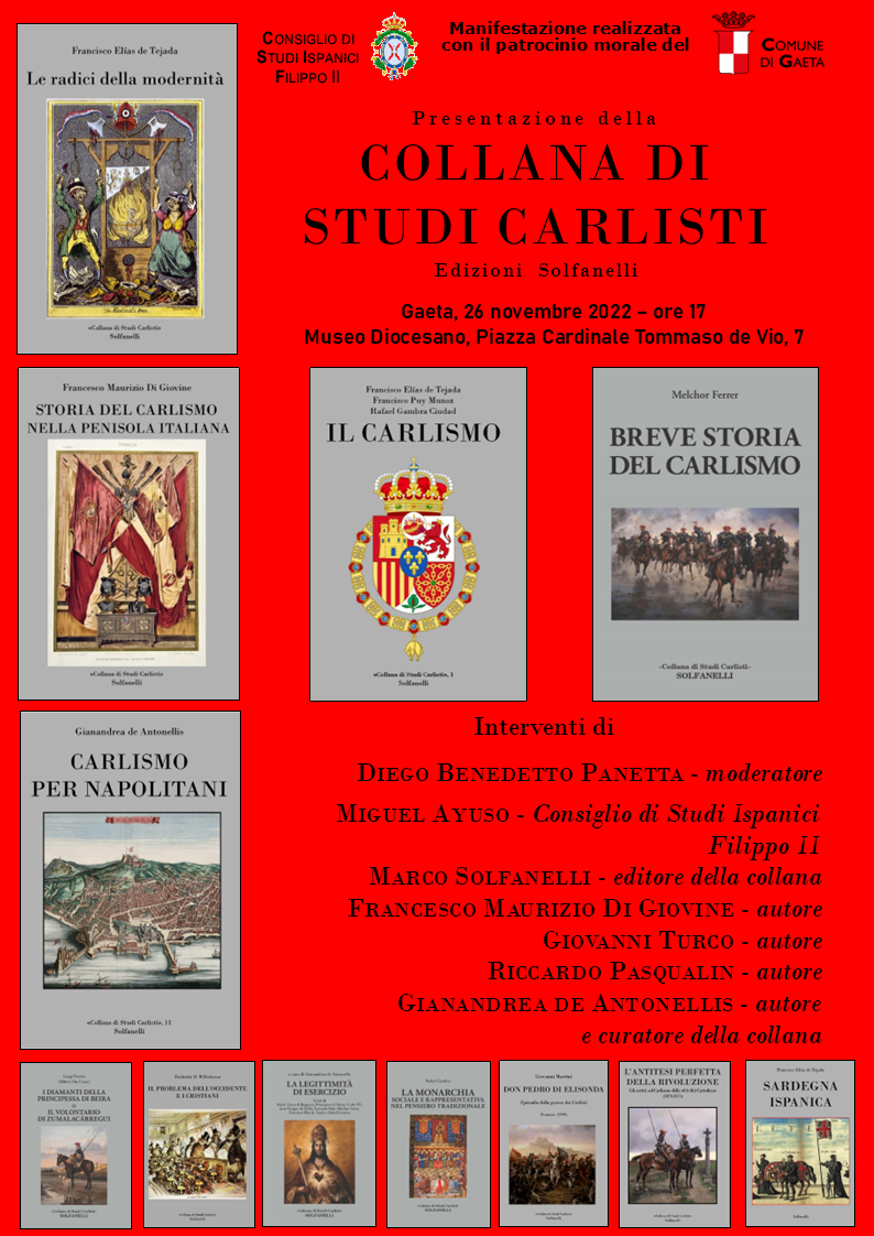 El sábado 26 de noviembre de 2022, a las 17:00 (cinco de la tarde, D.m.) en el Museo Diocesano de Gaeta (Piazza Cardinale Tommaso de Vio, 7) tendrá lugar la primera presentación pública de la Collana di Studi Carlisti (Colección de Estudios Carlistas) que están publicando las Ediciones Solfanelli, de Chieti.