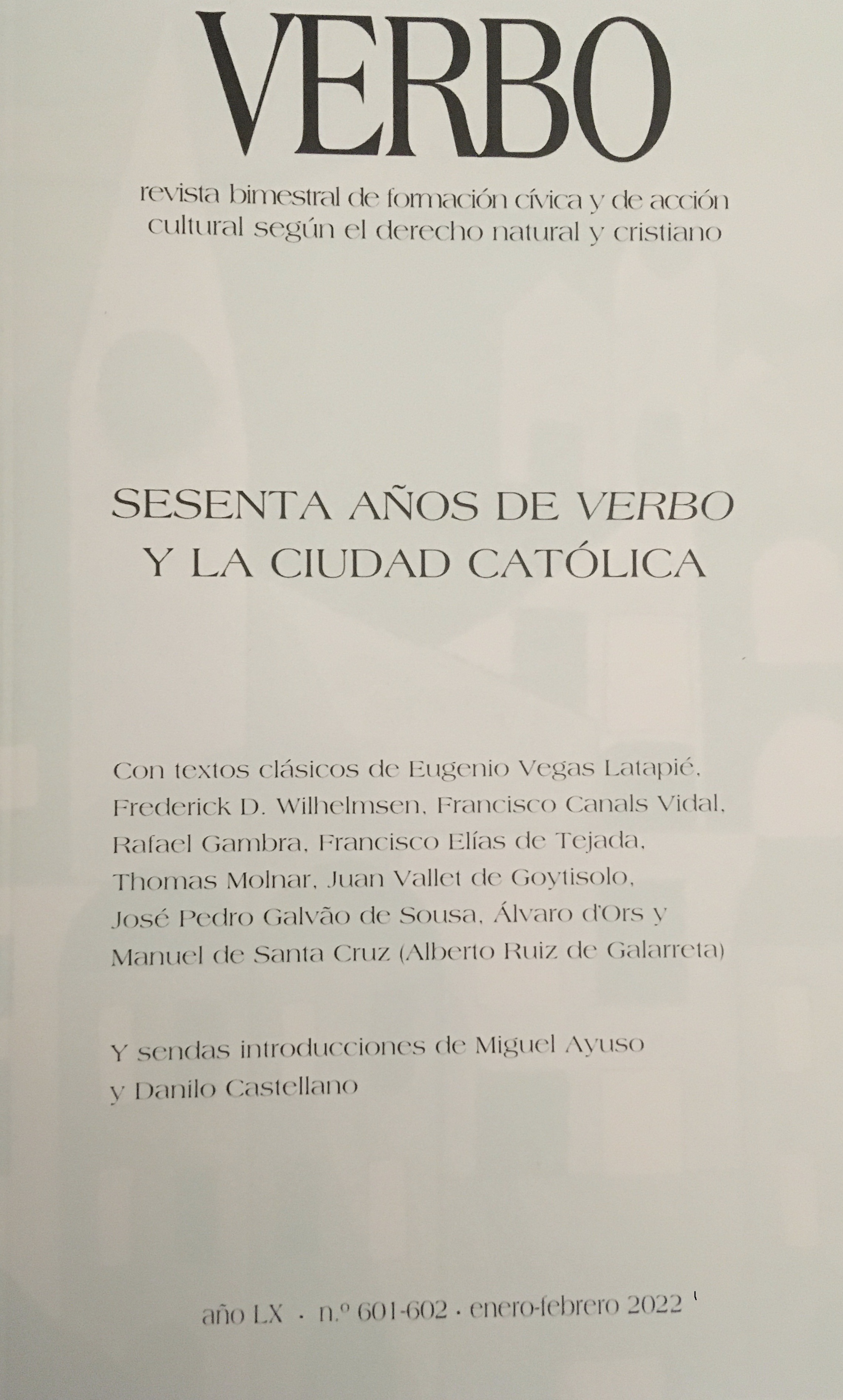 Especial es, sin duda, este número 601-602 (enero-febrero 2022) de Verbo, revista bimestral de formación cívica y de acción cultural según el derecho natural y cristiano. El motivo lo explica así su Presentación: