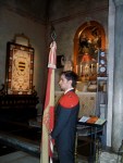 Terminado el seminario cerca de las 18:15, una buena parte de los numerosos participantes, que se comenzaron a tocar con boinas rojas y blancas, se encaminaron a la Catedral de San Justo, donde esperaban otros amigos, y donde en la puerta se fueron formando numerosos y animados corrillos que mezclaban con frecuencia castellano e italiano. Cerca de las 19 horas fueron ocupando las sillas dispuestas al efecto mirando al altar de la capilla de San Carlos Borromeo, primera de la nave de la epístola, donde están enterrados los restos del Rey Carlos VII y de sus antecesores los Reyes Carlos V, Carlos VI y Juan III, la Princesa de Beira y otros miembros de la Familia Real española. El altar estaba adornado con el «paliotto», o revestimiento delantero, que lleva bordadas las armas de España y las iniciales del Rey Carlos VII y su mujer la Reina. Monseñor Ignacio Barreiro, capellán del Papa, y nuestro también, por qué no, salió igualmente revestido de antiguos ornamentos litúrgicos que llevaban las armas de España, contrastando con el negro fúnebre. Cuando sale, apenas ha ocupado su sitial en la presidencia S.A.R. Don Sixto Enrique de Borbón, mientras que frente a él se sitúa el joven Miguel Gambra, que porta la bandera del Tercio del Rey, con restos de sangre, de nuestra Cruzada de Liberación, traída con cariño por Íñigo Pérez de Rada. Momento sin duda emocionante, pues Don Sixto Enrique presidía la Misa de aniversario del centenario por Don Carlos VII en el mismo lugar donde cien años antes su padre, que luego sería el Rey Don Javier, había ocupado también un puesto en la presidencia de los funerales. La diferencia, quizá, radicaba en que esta vez, a diferencia de aquélla, y no hay más que leer –quien quisiere– las páginas del Melchor Ferrer, Don Sixto Enrique se encontraba solo, sin otros príncipes reales. Aunque, eso sí, rodeado de leales. La liturgia, pese a alguna dificultad gracias a Dios al final solventada, se celebró en el rito inmemorial de la Iglesia codificado por San Pío V, y no faltó detalle, como el de los misales entregados a los asistentes con el común y el propio de la «Missa in anniversario defunctorum», «en sufragio de S.M.C. Don Carlos VII, Rey legítimo de las Españas». Monseñor Barreiro pronunció un hermoso sermón sobre el profundo sentido católico del Carlismo, con referencia al pensamiento político-religioso de Don Carlos VII. Al alzar rindió la bandera el alférez. Finalizada la Misa un coro gregoriano venido de Venecia y Bolonia, procurado por nuestros queridos amigos de «Una Voce», la doctora Alessandra Codivilla y el profesor Fabio Marino, respectivamente presidente de la asociación de Bolonia y coordinador de las asociaciones de las Venecias, ambos presentes en los actos. Tras despedirse del párroco, Monseñor Giorgio Carnelos, que saludó al Duque de Aranjuez, los presentes se congregaron en la puerta para cantar el Oriamendi.