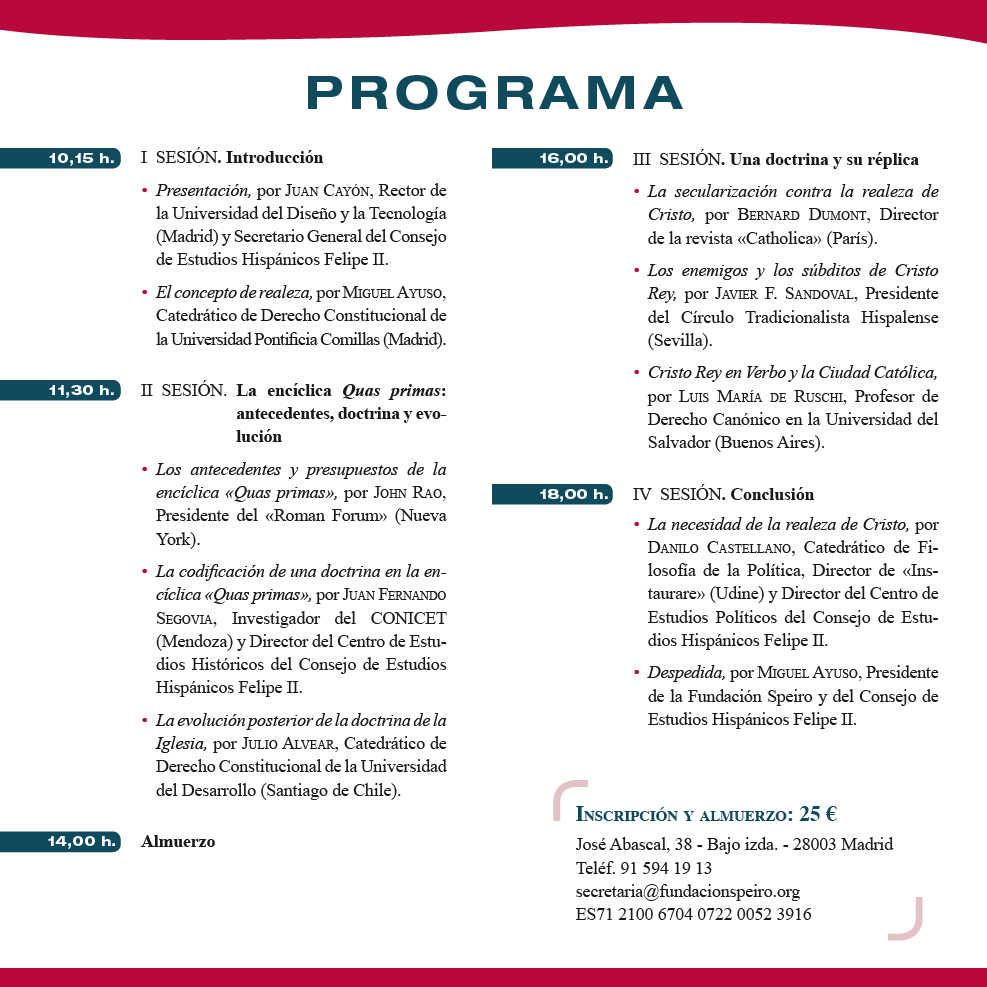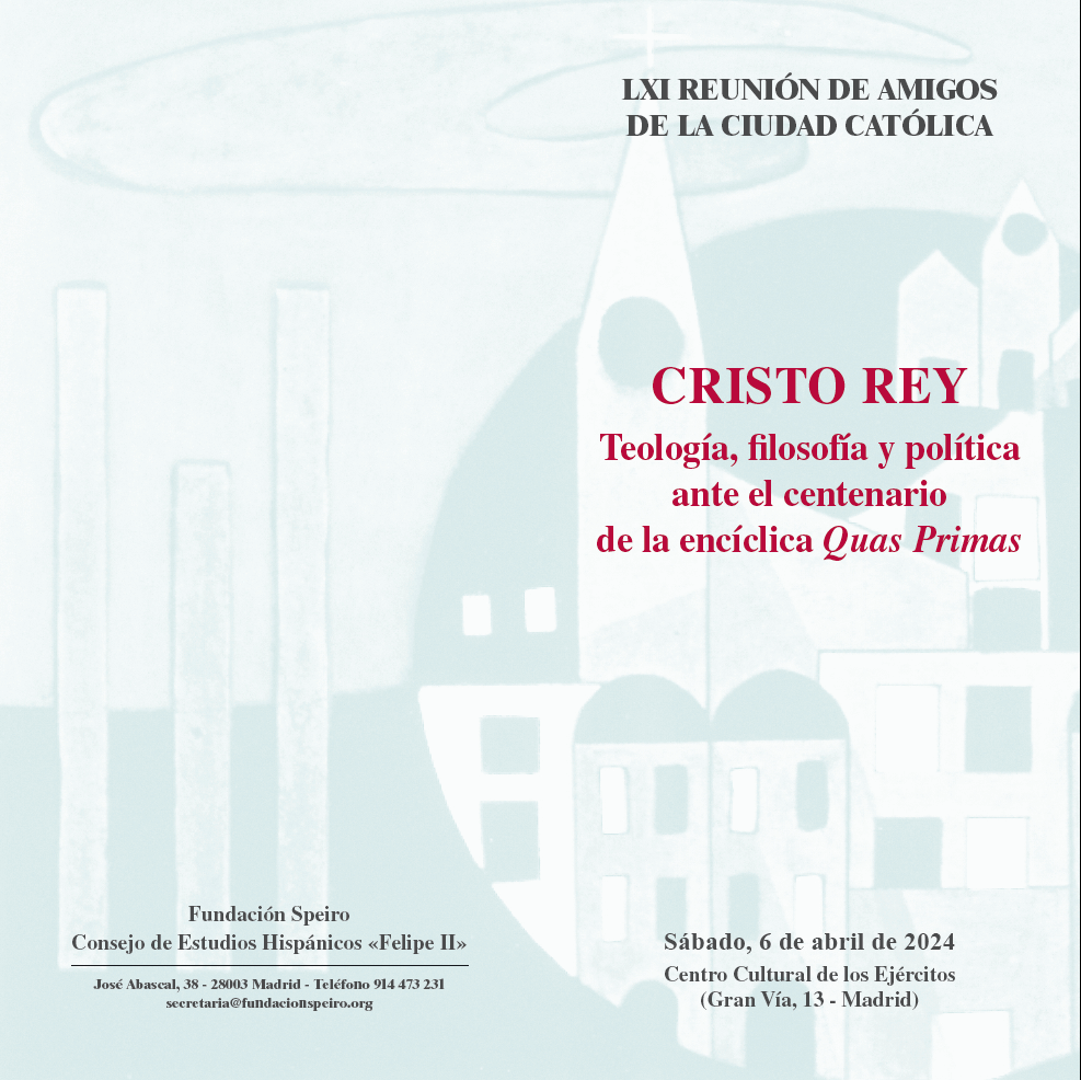 La LXI Reunión de Amigos de la Ciudad Católica tendrá lugar, D.m., el sábado 6 de abril de 2024, a partir de las diez de la mañana, en el Centro Cultural de los Ejércitos (Gran Vía, 13, Madrid), sobre el tema «CRISTO REY. Teología, filosofía y política ante el centenario de la encíclica Quas Primas».