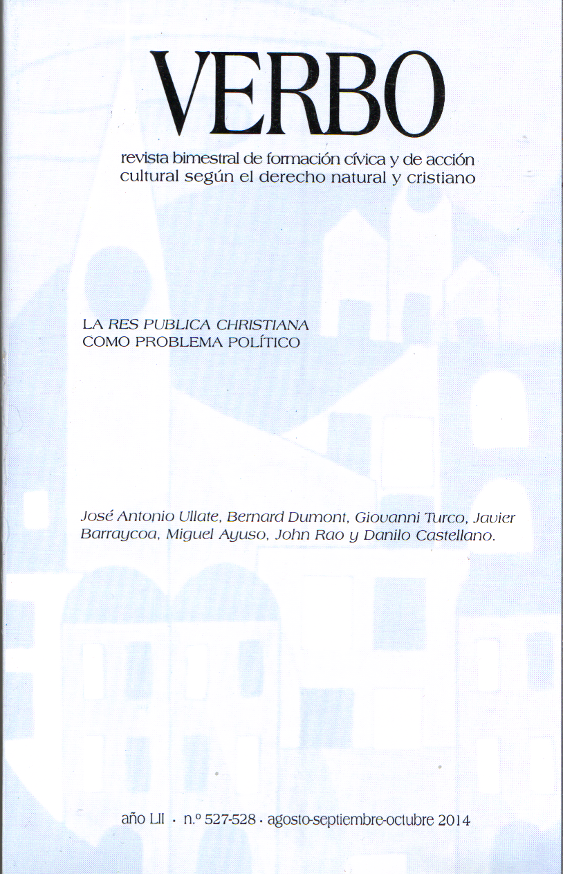 Ya en nuestras manos el número 527-528 (agosto-septiembre-octubre 2014) de Verbo, «revista bimestral de formación cívica y de acción cultural según el derecho natural y cristiano», vemos que presenta la particularidad de dedicarse monográficamente a la importantísima LI Reunión de Amigos de la Ciudad Católica que tuvo lugar en Madrid el 5 de abril de este año, bajo el lema «La res publica christiana como problema político».