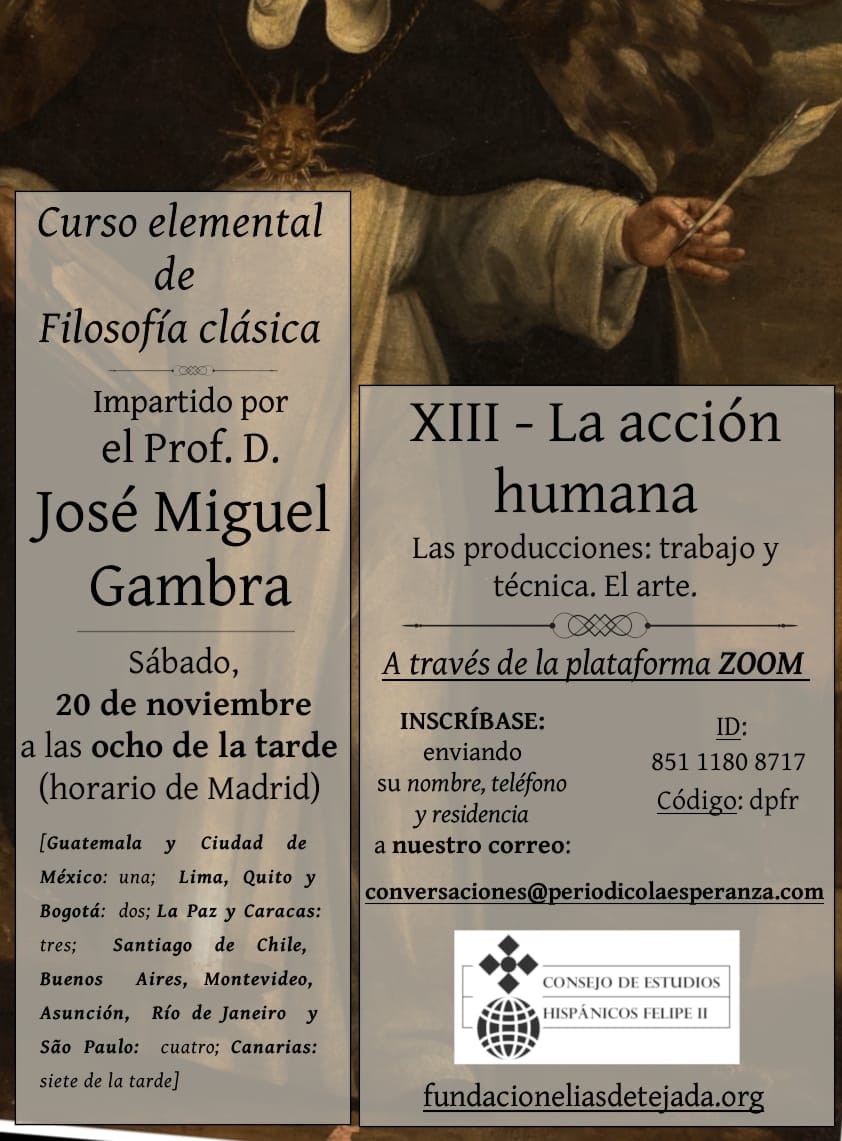 Dentro del curso elemental de filosofía clásica organizado por el Consejo de Estudios Hispánicos Felipe II, el Profesor José Miguel Gambra Gutiérrez (Catedrático de Lógica de la Universidad Complutense de Madrid) impartirá el sábado 20 de noviembre de 2021, a las 20:00 (ocho de la tarde, hora oficial de Madrid) la decimocuarta de las sesiones previstas (lección XIII): «La acción humana. Las producciones: trabajo y técnica. El arte». Esta lección iniciará la exposición del tercer bloque temático de Filosofía Práctica. Se utilizará, como de costumbre, la plataforma Zoom.