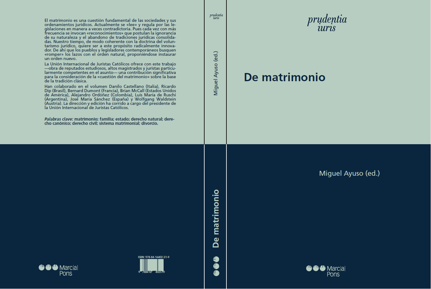 Ayuso, Miguel (ed.), De matrimonio. Marcial Pons, Madrid 2015. Colección Prudentia iuris, serie media. Cartoné, 22 x 16 cm. 176 páginas. ISBN 978-84-16402-51-9. Depósito Legal M-24.178-2015.