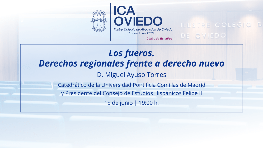 Invitado por el Centro de Estudios del Ilustre Colegio de Abogados de Oviedo y en su sede (C/. Schultz, 5), el jueves 15 de junio de 2023, a las 19:00 (siete de la tarde, D.m.) pronunciará una conferencia el Profesor Miguel Ayuso, bajo el título «Los fueros. Derechos regionales frente a derecho nuevo». La entrada es libre.