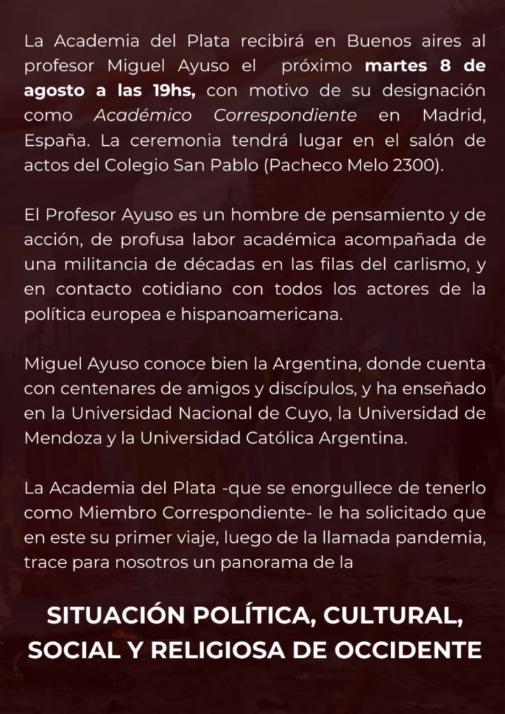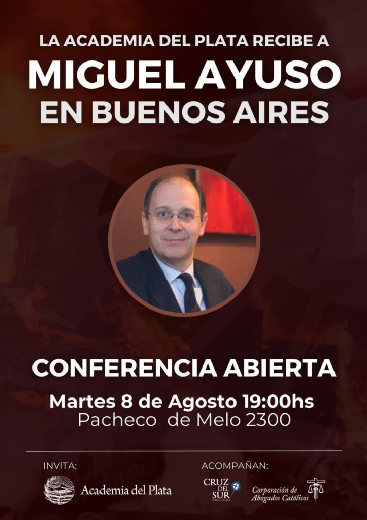 El martes 8 de agosto de 2023, a las 19:00 (siete de la tarde, D.m.) la Academia del Plata recibe al presidente del Consejo de Estudios Hispánicos Felipe II, Profesor Miguel Ayuso Torres, con motivo de su designación como Académico Correspondiente de la misma.