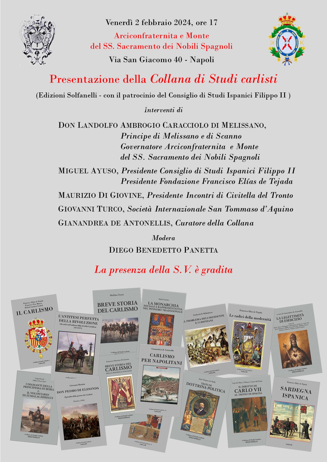 La «Collana di Studi carlisti», patrocinata dal Consiglio di Studi Ispanici Filippo II — fondato da Francisco Elías de Tejada e ora indegnamente presieduto da chi si rivolge a voi —, ha riunito una serie di testi di grande importanza per la comprensione del fenomeno del legittimismo carlista, in cui si incontrano i nomi dello storico Melchor Ferrer, dello stesso Francisco Elías de Tejada, dei professori Rafael Gambra e Frederick D. Wilhelmsen, e del più importante pensatore della fine del XIX secolo, Juan Vázquez de Mella. Oltre ad altre opere monografiche sulle radici della modernità, sulla legittimità di esercizio o sulla figura di Carlo VII nelle pagine de «La Civiltà Cattolica». Nonché alcuni testi di carattere letterario. In poco tempo sono stati raggiunti tredici titoli e il torchio di de Antonellis non si ferma.
