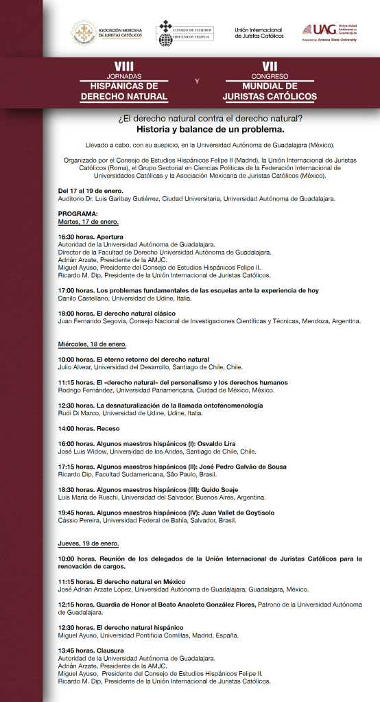 Los próximos días 17 a 19 de enero de 2023, al medio siglo de las primeras, en la Universidad Autónoma de Guadalajara (Méjico) se van a celebrar las VIII Jornadas Hispánicas de Derecho Natural, contemporáneamente con el VII Congreso Mundial de Juristas Católicos.