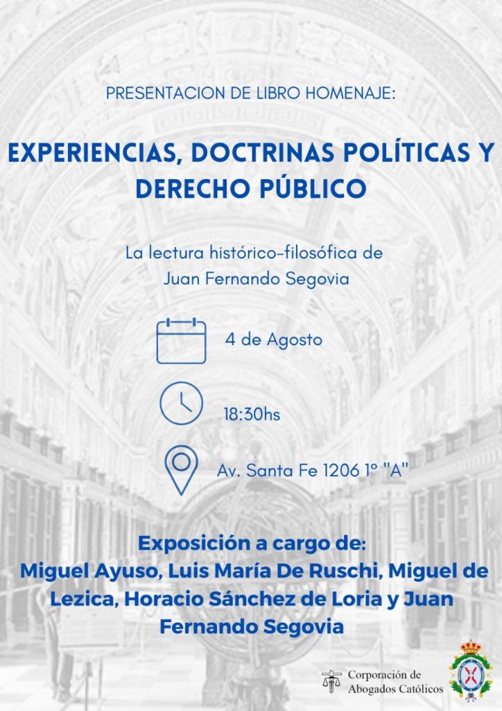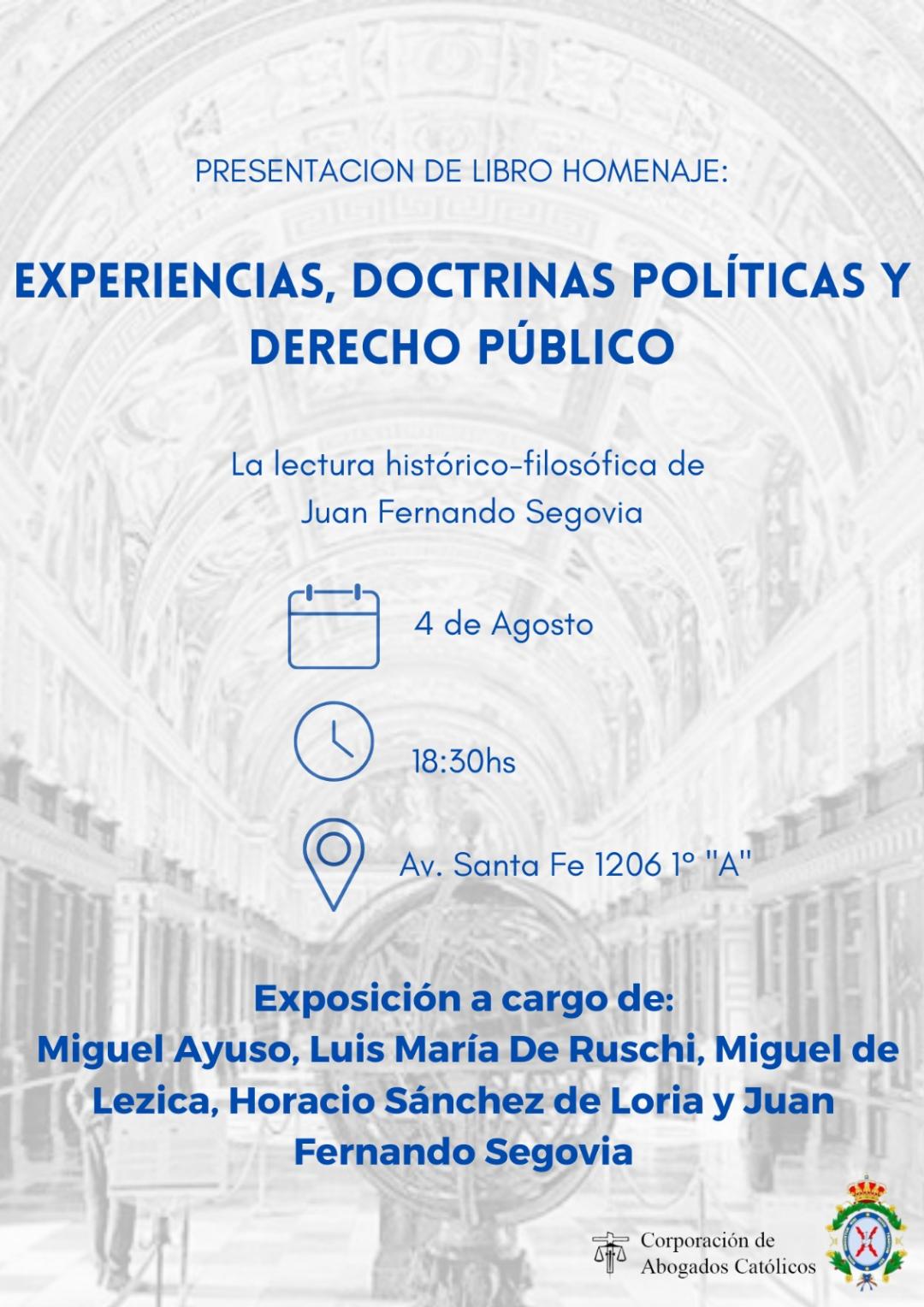 La Corporación de Abogados Católicos y el Consejo de Estudios Hispánicos Felipe II invitan a la presentación del libro Experiencia, doctrinas políticas y derecho público. La lectura histórico-filosófica de Juan Fernando Segovia (Marcial Pons, Madrid 2023), que tendrá lugar, D.m., el viernes 4 de agosto de 2023, a las 18:30 horas (seis y media de la tarde, D.m.) en Buenos Aires, Avda. Santa Fe (esquina con Libertad), 106, 1º A.