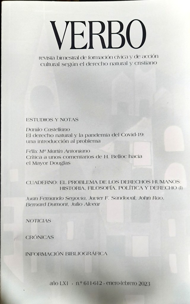 Comienza la serie sexagésimo primera de Verbo con la primera parte del cuaderno que recoge las actas de la LIX Reunión de amigos de la Ciudad Católica, dedicada al problema de los derechos humanos. Es la primera vez que se aborda monográficamente la cuestión y se ha hecho de modo original al mismo tiempo que riguroso. En esta primera ocasión encontramos los textos de Juan Fernando Segovia, Javier F. Sandoval, John Rao, Bernard Dumont y Julio Alvear. El primero, que trata del origen de los derechos humanos, se concentra en la libertad de conciencia y la autoconservación. A continuación, Javier F. Sandoval se ocupa del tránsito entre la ley natural y los derechos humanos. La dimensión histórica se completa con el trabajo de John Rao sobre la ideología de los derechos humanos, que encuentra en el gnosticismo, el sofismo y —paradójicamente— la destrucción de la dignidad humana. Bernard Dumont, seguidamente, examina la dimensión sociológica de la categoría de los derechos humanos como verdadero mecanismo social. Finalmente, con la contribución de Julio Alvear introduce los aspectos jurídicos, que van a completarse en el número próximo.