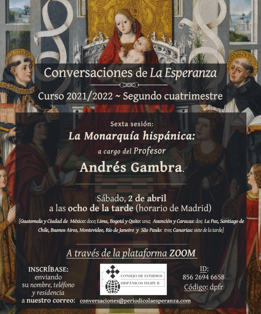Dentro del apartado de las crónicas recogemos el fin del ciclo de las Conversaciones de La Esperanza correspondiente al segundo semestre del curso 2021/2022. Tras el que se abre la pausa veraniega boreal, durante la cual —como en la austral los meses de enero y febrero— se suspende una actividad que abraza a las dos orillas de la Hispanidad.