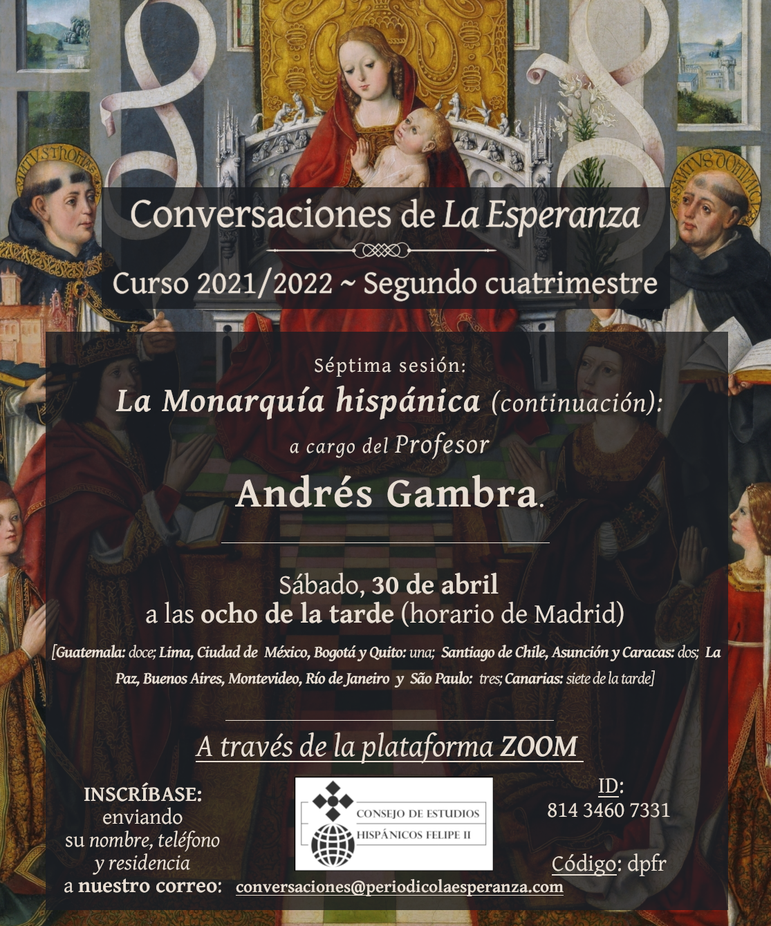 Dentro del apartado de las crónicas recogemos el fin del ciclo de las Conversaciones de La Esperanza correspondiente al segundo semestre del curso 2021/2022. Tras el que se abre la pausa veraniega boreal, durante la cual —como en la austral los meses de enero y febrero— se suspende una actividad que abraza a las dos orillas de la Hispanidad.
